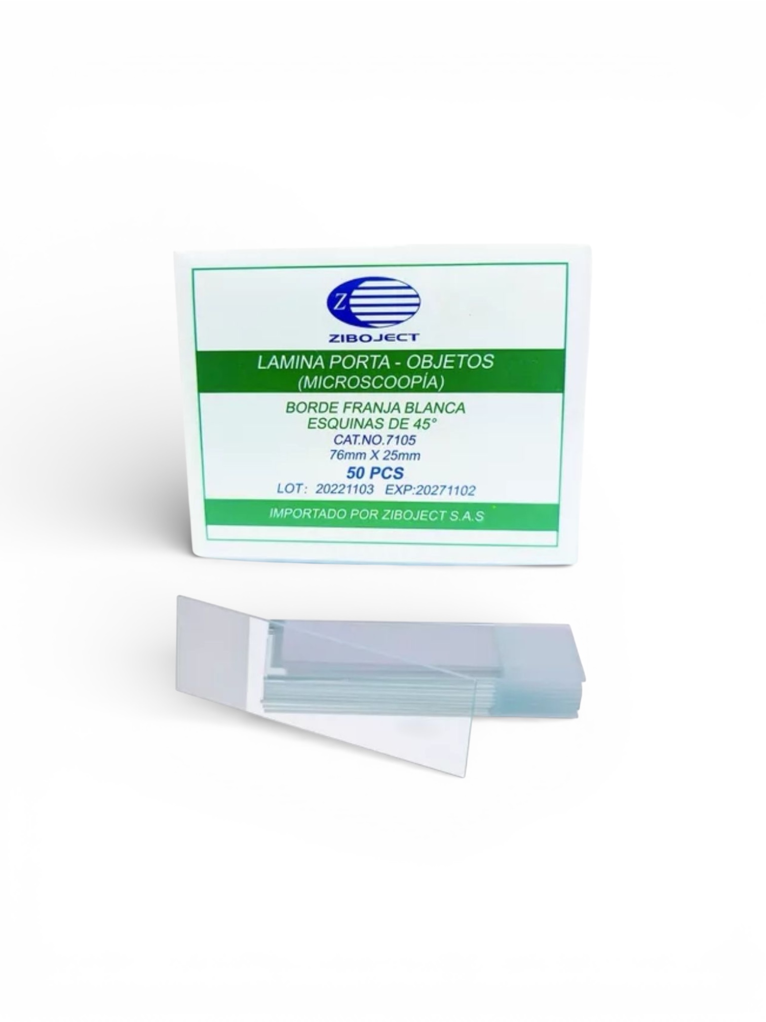 Lámina porta objeto Ziboject de 25.4 × 76.2 mm con franja matte esmerilada (Ref. 7105), fabricada en vidrio de alta transparencia para preparación y observación de muestras en microscopía.